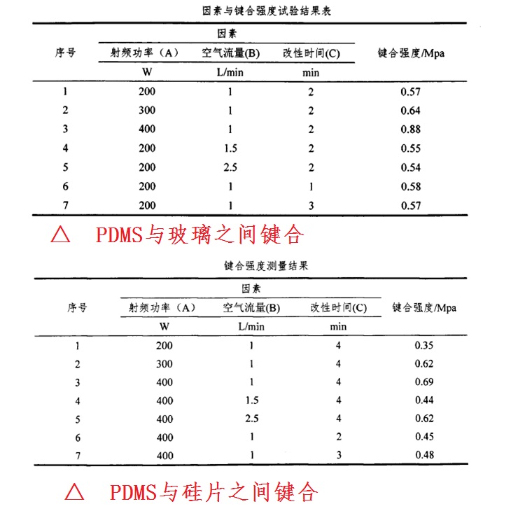 等離子表面處理在PDMS不可逆鍵合前,特別是PDMS同質(zhì)異質(zhì)不可逆鍵合時的工藝參數(shù),都有可能產(chǎn)生交互式影響。